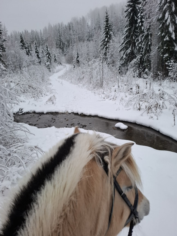 Men nu är hon igenom det hela och precis som vanligt. Eller kanske lite mer Tingla än vanligt under de fem pass hon ridits. Hon fick vila åtta dagar i samband med vaccinationen och när vi satte igång henne var det spökläge på. I början av november när kylan kom hade hon en riktig spökperiod när hon låtsade vara rädd för allt, var fruktansvärt pigg och bubblade över med jämna mellanrum. Nu har hon en sån period igen. T.ex. när Ellinor och jag var ute och red i lördags stannade vi till för att Irma skulle komma ikapp. Då se Tingla plötsligt att det rinner vatten i det snöfylla diket, ett svart hål. Hon börjar drakblåsa, tvärvänder och springer in i stackars Irma som inte förstår nåt alls. Hon är ju inte rädd för mörka hål. Hon är ju Irma.