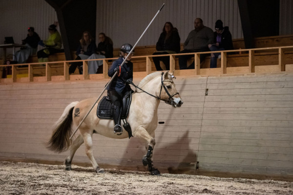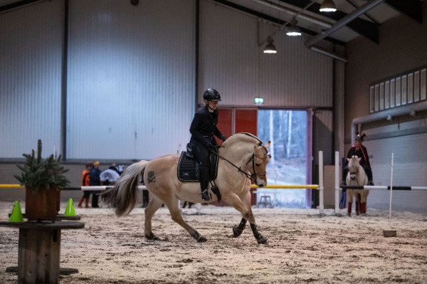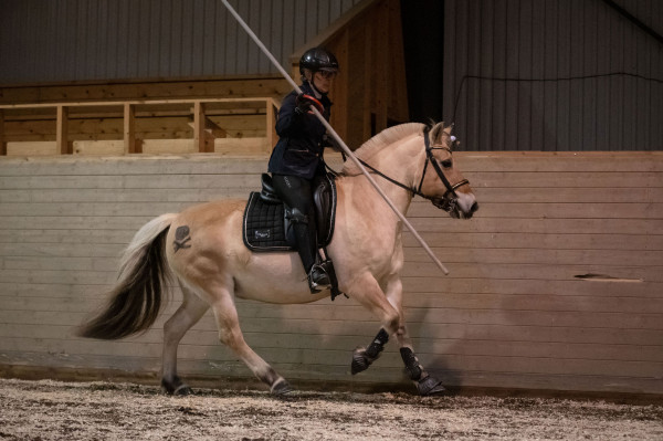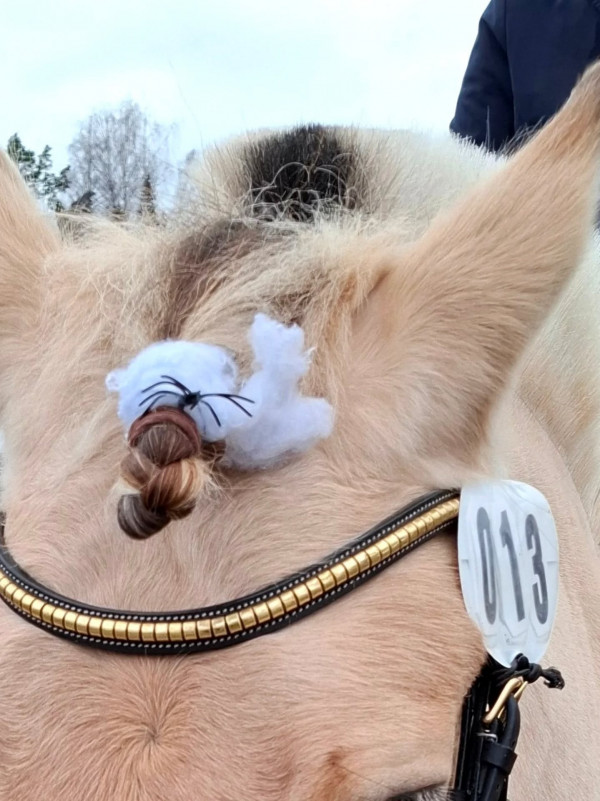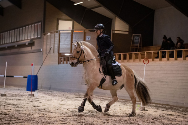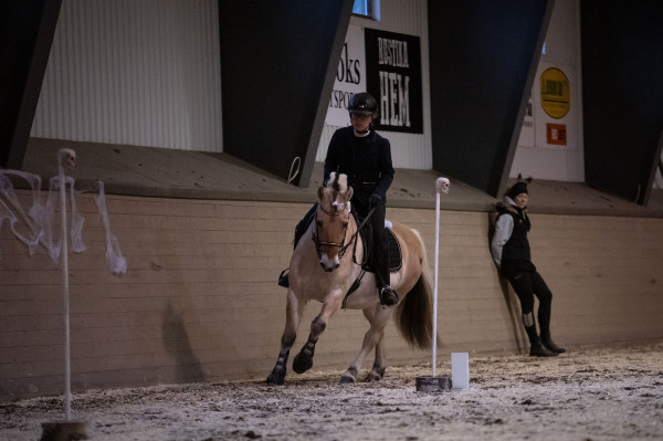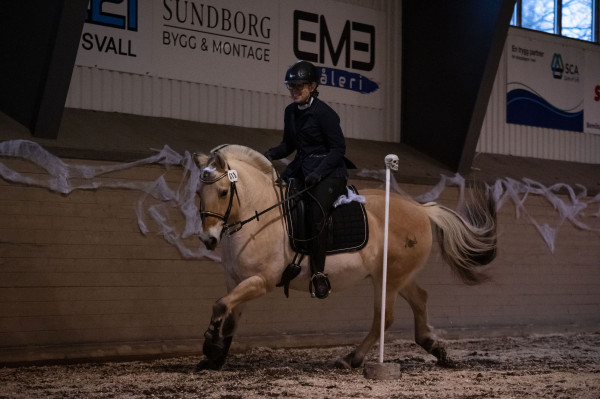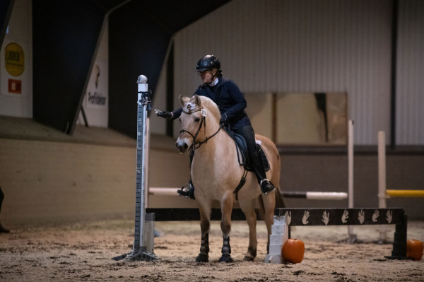 Väl på plats var hon faktiskt rätt cool till en början och framridningen kändes jättebra. Men ridhuset var utspökat med Halloween-tema så när vi kom in på banan började det ryka ur öronen och brinna under skorna. Banan innehöll 12 hinder. Vi inledde med slalom i bibehållen höger galopp som inte gick alls pga. spindelvävsludd på väggen. Korsgalopp och trav stora delar gav en trea. Sen följde tre tunnor, fortfarande hetsigt men gick okej. Samma med grinden. Fjärde hindret var sidepass för höger skänkel som började bra men på slutat såg hon luddet och spände sig igen och klonkade i bommen. Vidare på två tunnor och nu började hon slappna av. Klocka i korridor gick jättebra. Lans ur och ring gick super. Sen schabblade jag till det och välte lansen när den skulle i tunnan så en nolla där. Inte Tinglas fel, hon var lugn och fin. Sidvärts över bom för vänster skänkel och flytta mugg gick jättebra. Sen avslutade vi med slalom i vänster galopp som var lika svårt som i höger pga. spökväggen.