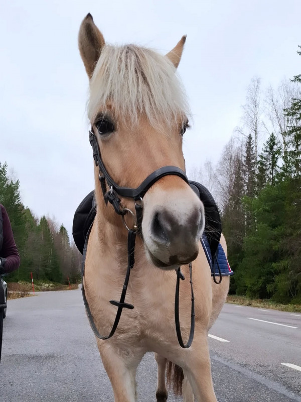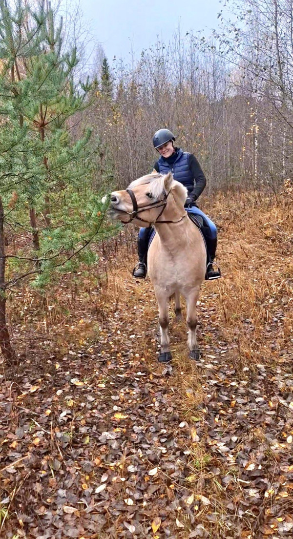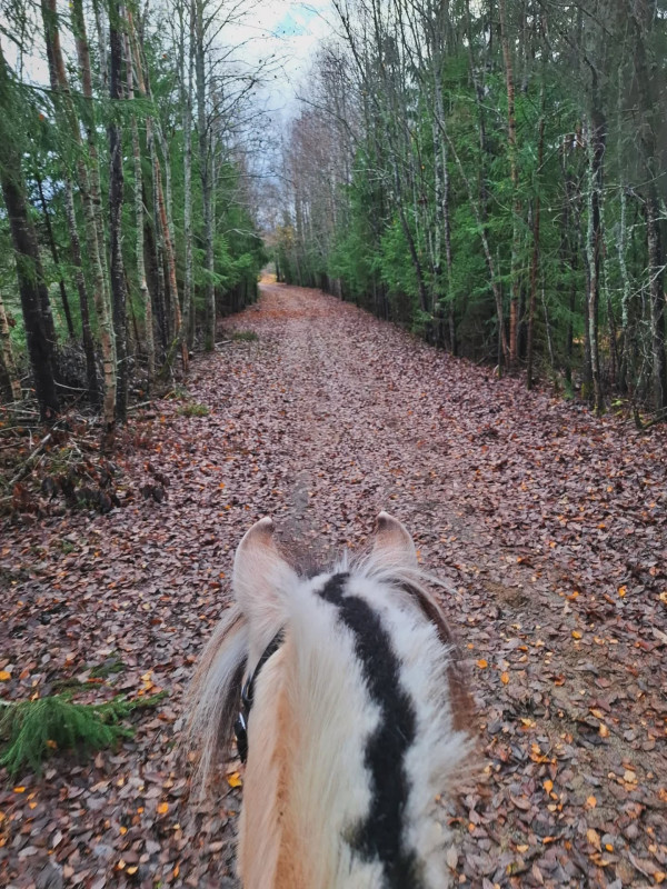 Målet med Viva nästa år är debut i LA dressyr så jag jobbar mycket med att stärka galoppen och den blir väldigt fin på töm. Viva har lite lättare för samling än sin mor. Jag vet inte om det är fysiskt eller psykiskt men hennes galopp är helt klart enklare att hitta balansen i. Viva har också varit på utflykt med mig tillsammans med Ellinor och Irma. Den morgonen åkte jag först iväg med Tingla. Det är ca 10 min resa med släpet till jättefina ridvägar så vi åker ofta dit om helgerna. Tingla brukar vara taggad där men denna dag var det fullkomlig spökvandring. Hon tvärvände och stack, drakblåste, galopperade på stället osv pga löv, rotvälta, trädgård. Allt såg i mina ögon såg ut som vanligt men så var det inte i Tinglas värld. Irma och Viva åkte några timmar senare till samma plats. Då hade det tillkommit en dagisutflykt med typ 15 barn och några vuxna. De eldade, grillade och sprang runt. Sen var det en traktor som flyttade stockar som lät ganska mycket. Irma och Viva såg inga problem med något av detta. Tänk så olika det kan vara.