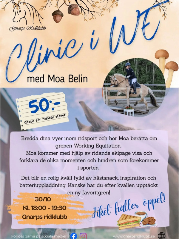 Jag har varit i Gnarp och haft en cliniq i WE. Ganska många slöt upp denna regniga och mörka oktoberkväll. Nu är det ytterligare två träningar bokade där och en i Timrå innan jul. Själv känner jag mig sugen på att träna mer WE för tränare men vi går snart in i den del av året som inte är så kul att köra släp i så kanske blir det våren projekt. Vi ska i alla fall träna mycket på styrkan i galoppen i vinter, enkla byten och att galoppera på en hand i balans. Just nu är det lite nedtrappning med först två veckors vila för Irma, sedan Viva och sist Tingla. Karin ska också komma ut och vaccinera dem och kolla tänderna på Tingla, Irma och Krona. Viva tog vi i fjol och hon var så fin så där rekommenderade Karin koll varannat år. Så nedtrappning, mycket lera och mörker och jag har varit rätt trött periodvis. Men hästarna är som alltid ett ljus i mörkret.
