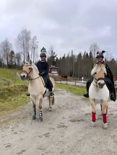 Det har varit mycket WE den sista tiden. Förra helgen var jag och Izabell i Matfors och tränade för My med Tingla och Viva. Jag hade tänkt rida Viva men när Tingla var minst sagt exalterad på träningen helgen före och jag planerat att starta henne på Halloween-tävlingen kändes det som ett bättre val att rida henne. Viva gjorde sitt livs första bortaträning och det gick jättebra! Hon var jättefin i formen och jag blev stolt över att det där är min häst. Absolut att hon tittar lite på saker men hon är väldigt kommunikativ. Hon gick för första gången med en fullt lång lans t.ex. och det var inga problem. Grinden var det enda som trasslade lite och det tror jag dels beror på att hon blev lite spänd när hon gick grinden på Freddys minne som var lite speciell, dels att det var ett ganska grovt rep och dels att Izabell inte heller ridit grinden jättemånga gånger. Hon backade ifrån den när Izabell skulle stänga. Tingla tittade på henne med en min av ”herregud” så jag red lite närmare och när Viva tänkte gå ifrån grinden bet Tingla lite i luften åt henne och då gick Vivan tillbaka till grinden och lät Izabell stänga den medan hon lugnt och fint stod alldeles stilla. Tänk vilket stöd i livet en mamma ändå kan vara flera meter bort!